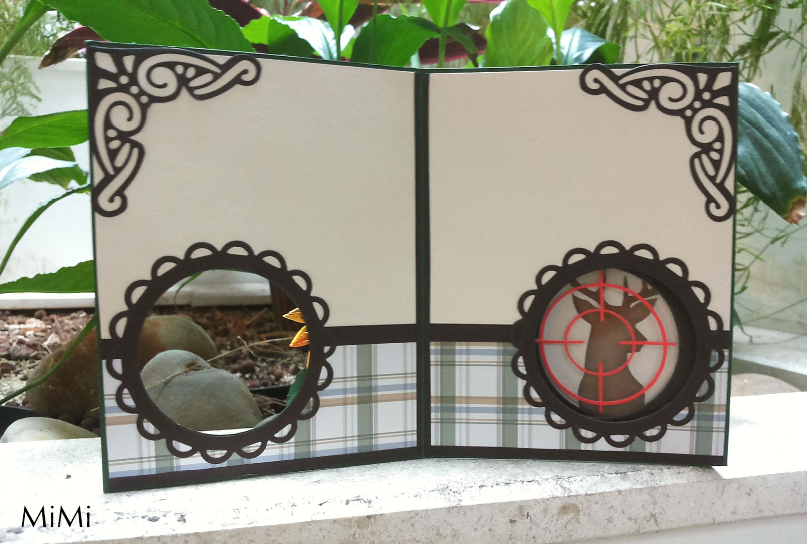 Картичката е в т.нар. "pick a boo" стил, в който при отваряне на предното крило се задвижва прозорчето с мишената, която застава пред благородният елен....